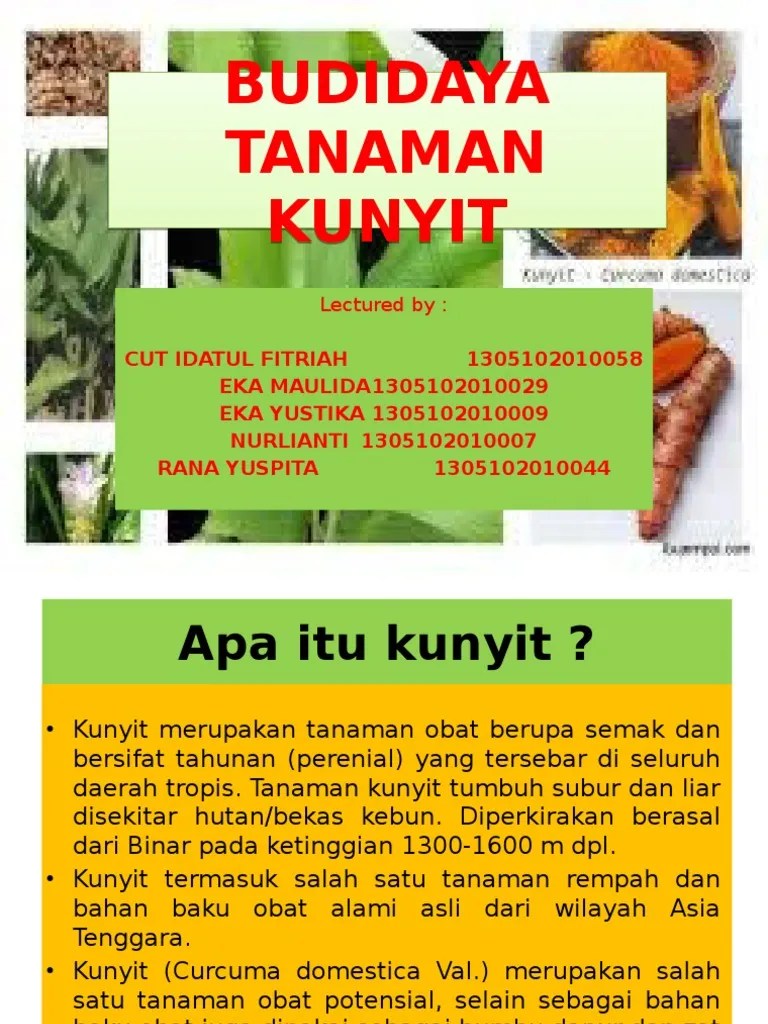 Anda pun bisa menanam kunyit dengan mudah di rumah, baik di tanah di. Bila ditanam di daerah curah hujan < 1000 mm/tahun, maka lahan harus memiliki sistem pengairan yang tertata baik. Kunyit tumbuh subur pada tanah gembur, pada tanah yang dicangkul . Kebutuhan bibit dapat menyesuaikan luas lahan, nah untuk . Maka diharapkan akan diperoleh produksi .
