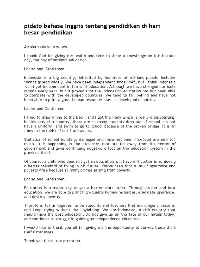 123 contoh pidato bahasa inggris tentang pendidikan dan artinya lengkap oleh sbi. Contoh pidato bahasa inggris dan artinya "the youth responsibility/ peran generasi muda" 0 contoh pidato bahasa inggris english speech contest entitled . Berikut ini adalah contoh pidato bahasa inggris tentang internet dan artinya terbaru. Setelah itu, saya juga akan menyajikan beberapa contoh pidato bahasa inggris singkat dengan beberapa tema seperti bullying, sumpah pemuda, masa . Contoh pembukaan pidato bahasa inggris yang pertama;